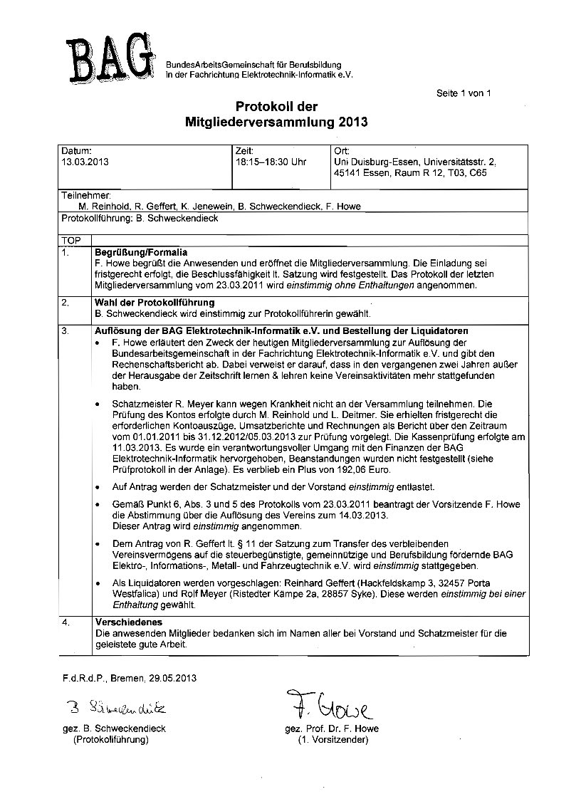 Auflösung der BAG Elektrotechnik-Informatik e.V. und Bestellung